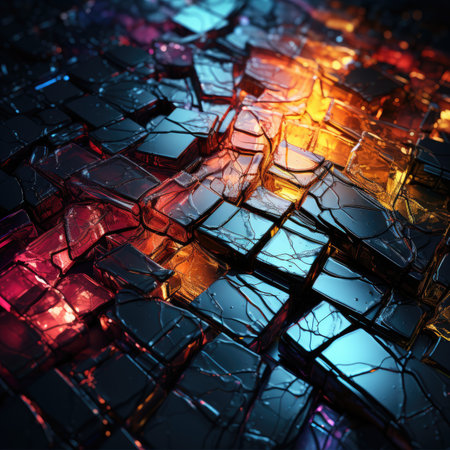 An abstract composition featuring geometric shapes illuminated with a vibrant, scattered light source. The arrangement evokes a modern, futuristic feel with its sharp angles and sleek textures.