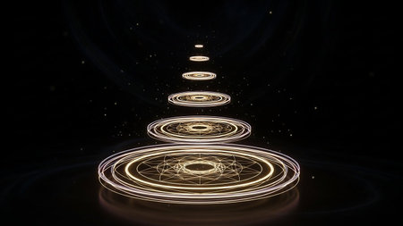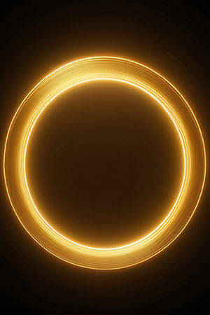 This image features a captivating pattern of golden light circles radiating outward from a central point. The circles create a sense of depth and movement, with the light becoming more intense towards the center. The background is dark, which enhances the brilliance and prominence of the golden circles.