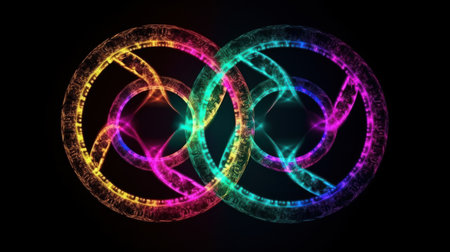 Visual representation delves into the intricate relationship in quantum physics showcasing interlocking circles and lines on a dark, luminous background that highlights their complexity. GenerativeAI.