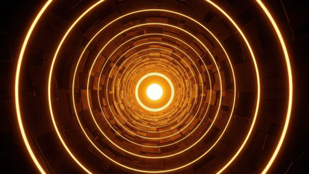 This image depicts a mesmerizing tunnel with a golden spiral pattern. The tunnel appears to extend infinitely, creating a sense of depth and mystery. The warm, golden hues add a sense of warmth and tranquility to the scene. The repetitive circular patterns draw the viewer's eye towards the vanishing point, evoking feelings of infinity and exploration.