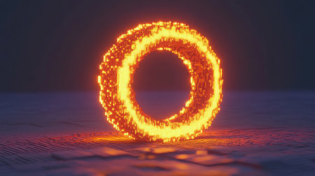 A vibrant glowing orange ring radiates energy in a dark space, showcasing a stunning pixelated design. This abstract composition captures attention with its modern aesthetic.