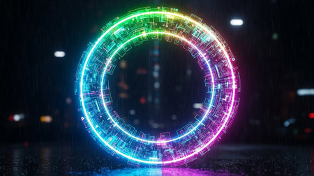 An intricate, circular neon portal with circuit board-like patterns glows vibrantly on a dark, wet street at night, reflecting the lights.