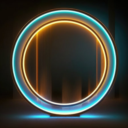 Vibrant and colorful glowing neon light circles create a captivating abstract scene on a dark surface, perfect for artistic and creative projects.