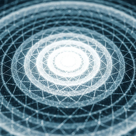 An intricate geometric mandala pattern composed of concentric circles and radiating lines, glowing with bright white and blue light against a dark background.