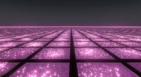 This image presents an abstract view of a grid-like floor structure with illuminated panels. The dominant colors are pink and black, with a perspective that creates a sense of depth and vastness. The lighting suggests an artificial setting, possibly indoors. It could be used for various commercial or editorial purposes.