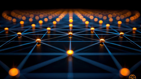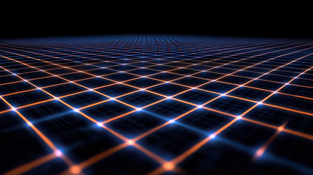 This stunning image features a glowing grid pattern with warm orange lights against a dark background, creating a captivating abstract design perfect for technology themes.