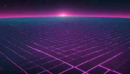This image showcases a futuristic digital grid illuminated by neon lines against a dark background. It conveys a sense of advanced technology and infinite possibilities, ideal for creative projects.