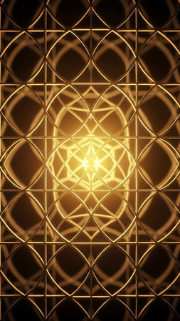 A symmetrical golden geometric pattern with intricate lines and a bright glowing center, creating a sense of radiant energy and cosmic connection.