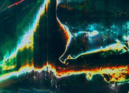 Glitch texture. Distortion overlay. Creased film. Green blue red white color stains light flares dust scratch defect uneven foil metallic surface illustration art abstract background.