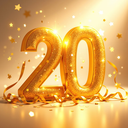 Large gold 20 surrounded by stars, ribbons, and confetti, shining brightly.
