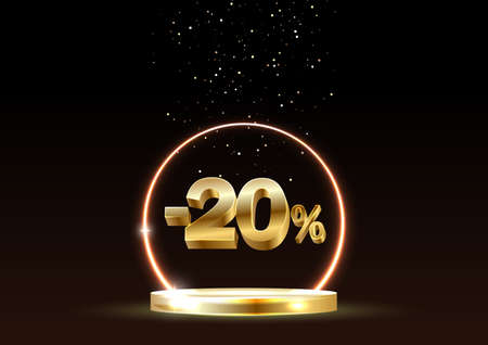 3d rendering of 20 percent price cut off. Golden discount coins letters isolated on white background
