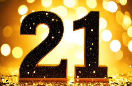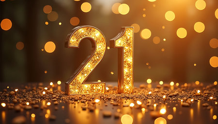 Golden number twenty one stands out amidst glittering specks and blurred bokeh lights, creating a festive and celebratory mood Use for birthday or event announcement.