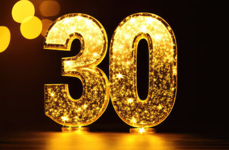 3d glowing number thirty on dark festive background with bokeh. birthday celebration.
