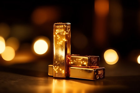 A stunning gold metal bar rests elegantly on a glittery surface, illuminated by a beautiful bokeh effect, representing wealth and luxury in a captivating manner.