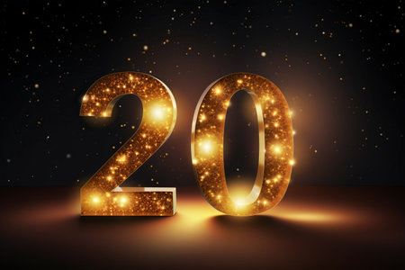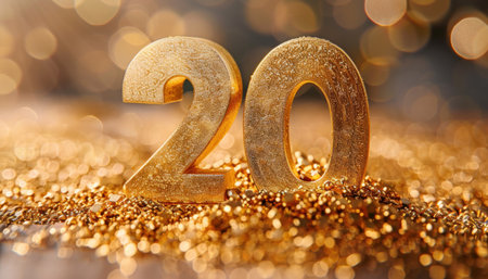 The astonishing number 20 is prominently placed atop a beautiful and shiny pile of sparkling gold glitter