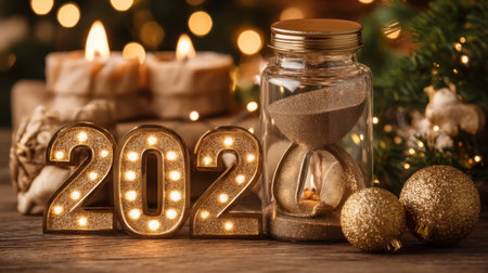 A cozy and festive setting showcases the countdown to 2020, featuring shimmering decorations, an hourglass, and warm candlelight creating a joyful ambiance.