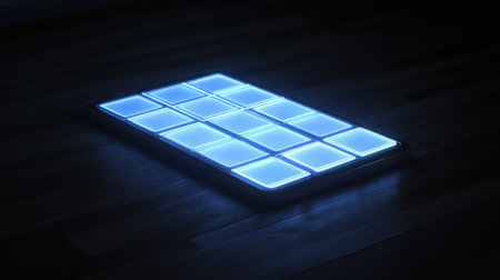 This image features a glowing light panel with a grid pattern set against a dark wooden floor, ideal for showcasing modern design and creative concepts.