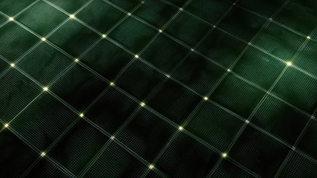 A vibrant green grid pattern featuring glowing dots creates a captivating digital atmosphere. This abstract image suits various design purposes, from technology to art.