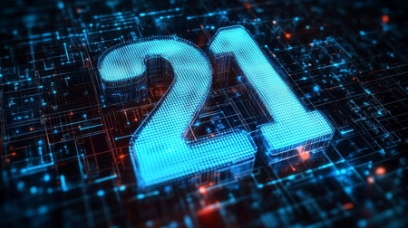 Glowing blue 3D number 21 on a digital circuit board background with a futuristic theme.