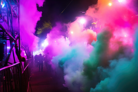 Vibrant concert stage with dramatic smoke and dynamic lighting effects