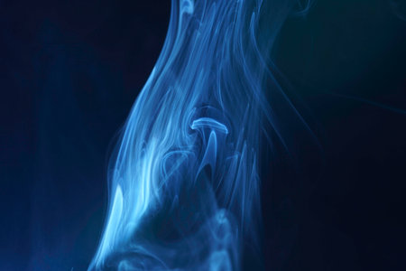 A man wearing glasses is enveloped in a mysterious blue smoke haze, creating an enigmatic and moody atmosphere with soft bokeh lighting.