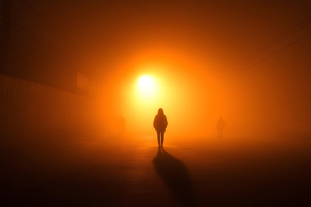 Silhouette of person walking in a foggy street under orange light, creating a mysterious and atmospheric scene