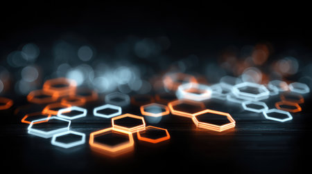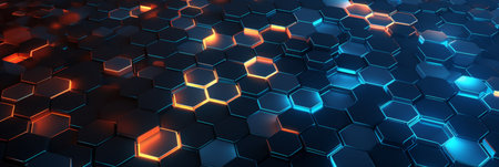 This abstract image features glowing hexagonal shapes in orange and blue against a dark background, symbolizing innovation, technology, and modern design aesthetics.