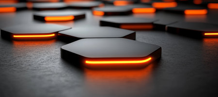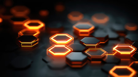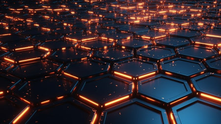 , low-angle perspective shot of a structured surface composed of dark, textured hexagonal shapes, where the edges emit a vibrant, intense orange luminescence, suggesting digital infrastructure, energy flow, or a sci-fi environment with a shallow depth of field blurring the foreground and background elements.