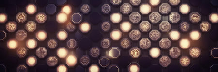 An abstract composition features a series of hexagonal shapes resembling flowers, arranged in a row. The elements are illuminated with a warm glow, creating a striking contrast against the dark background. The scene suggests a futuristic environment, offering potential use in design and illustration projects.