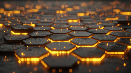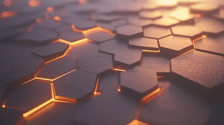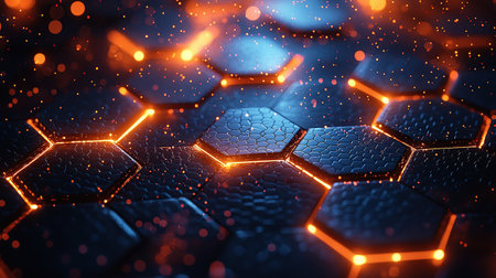 Intricate hexagonal pattern glowing with warm orange light in a dark environment creates a vibrant, modern atmosphere. Generative AI