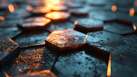 Abstract Black Hexagonal Shapes with Glowing Orange Lights on Grunge Surface, Shallow Depth
