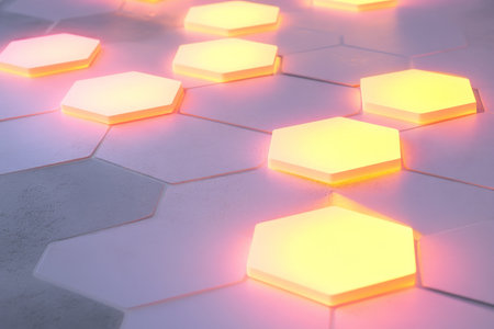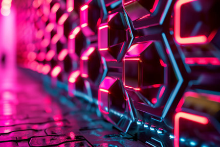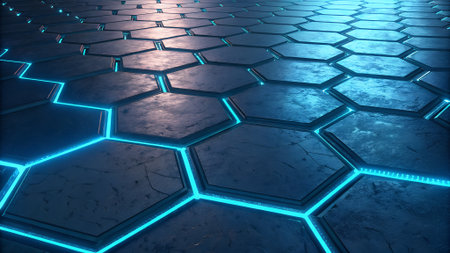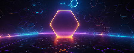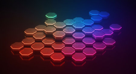 Vibrant hexagonal tiles illuminated with neon lights in a futuristic setting at night, creating a visually striking atmosphere. Generative AI