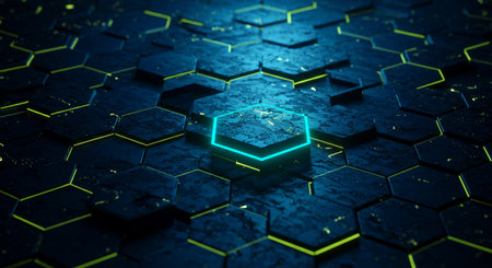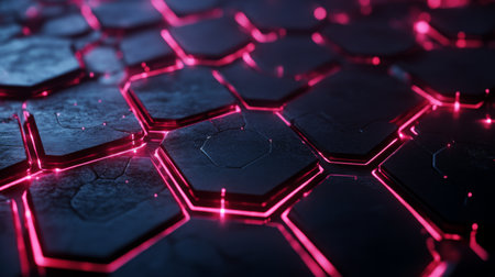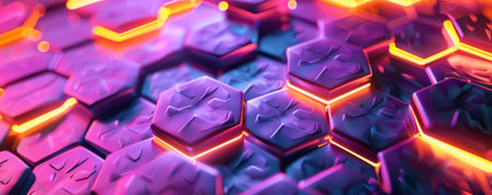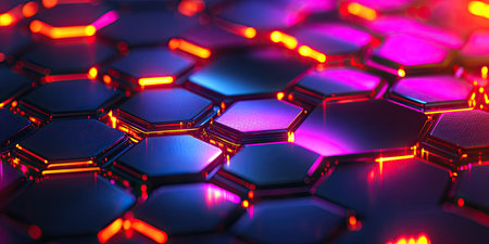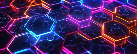 A striking close-up of hexagonal tiles featuring vibrant neon edges against a dark surface, perfect for technology, abstract art, and modern design projects.