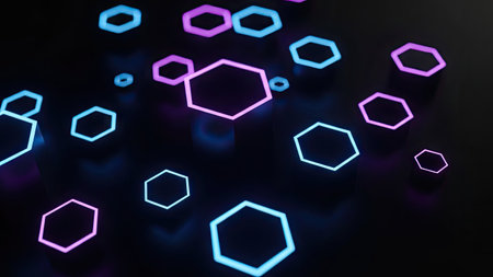 3d rendering of abstract hexagons in neon light on black background
