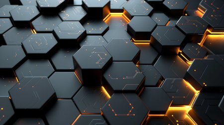 Modern abstract design featuring a black hexagonal grid with orange light accents, creating a high-tech and dynamic visual effect.