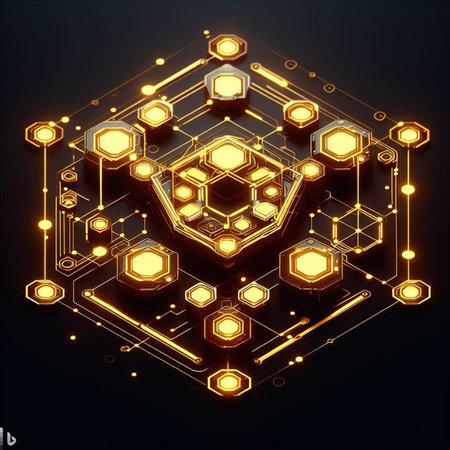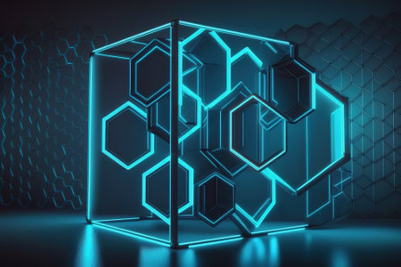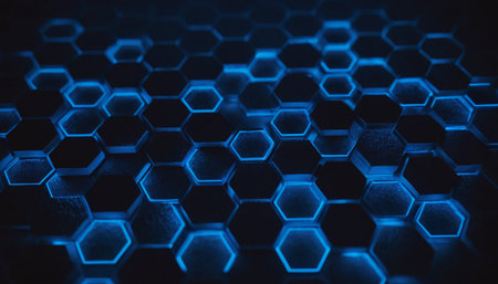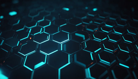 A modern digital concept of interlinked hexagons with glowing edges creates captivating visual effect. intricate design showcases blend of dark and luminous elements..