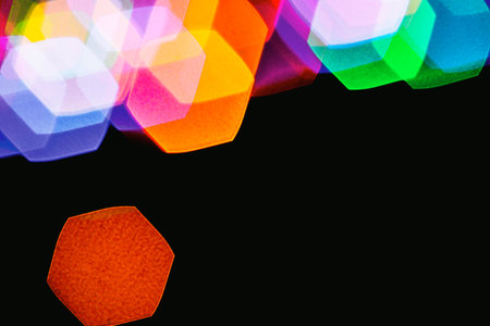 A close-up captures a collection of vibrant, multi-colored hexagonal shapes. Each form glows with a distinct hue, creating a striking contrast against a blurred, dark background. The composition utilizes a shallow depth of field, emphasizing the geometric objects. Suitable for various design applications, this image could be employed in digital media or decorative projects.