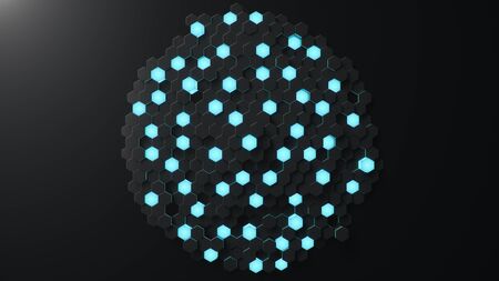 Abstract glowing hexagons on dark background. Technology and science concept. 3D Rendering