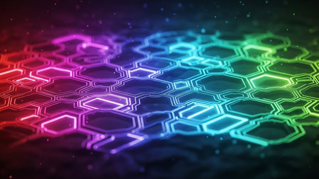 A futuristic hexagonal grid glows with a rainbow spectrum of neon light, set against a dark, textured surface with floating particles.