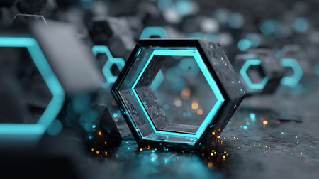 This image features two modern hexagonal shapes with glowing edges, cast against a dark gritty background, ideal for projects that require a sleek and futuristic aesthetic.