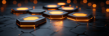 AI Generated. Glowing Hexagonal Platforms on Dark Surface