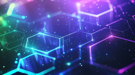 A neon background with a repeating pattern of glowing hexagons in neon blue and purple, creating a high-tech and futuristic feel.