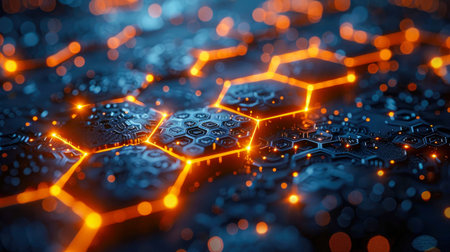 Intricate hexagonal pattern glowing with warm orange light in a dark environment creates a vibrant, modern atmosphere. Generative AI