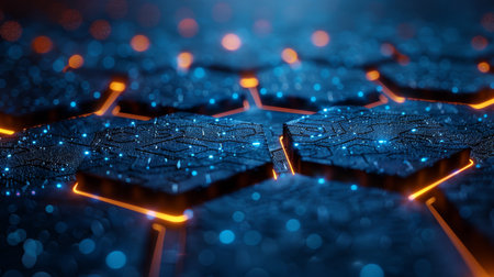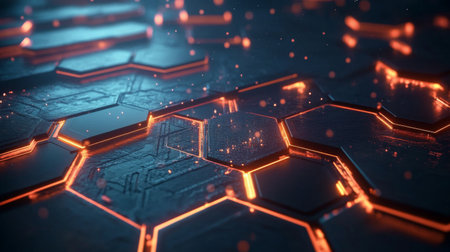 , low-angle perspective shot of a structured surface composed of dark, textured hexagonal shapes, where the edges emit a vibrant, intense orange luminescence, suggesting digital infrastructure, energy flow, or a sci-fi environment with a shallow depth of field blurring the foreground and background elements.