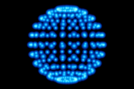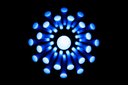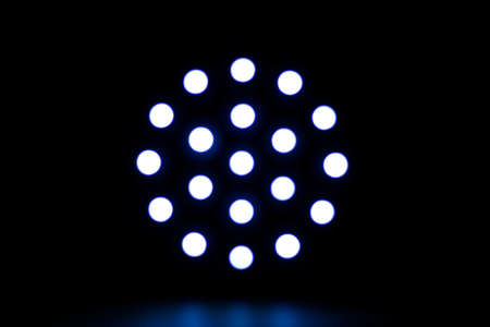 Twenty blue lights in the shape of an abstract circles on a black background.