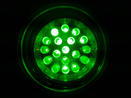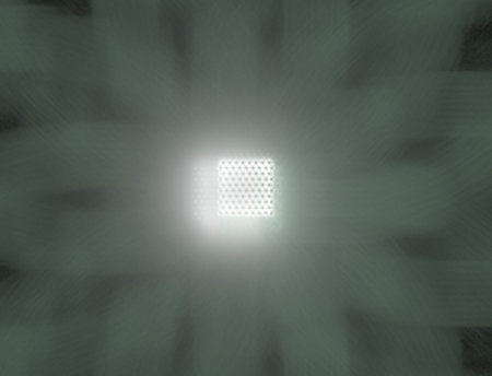 A repeating pattern of circular indentations, each emitting a soft green light, creates a mesmerizing visual on a dark, textured surface. The perspective emphasizes the depth and repetition.