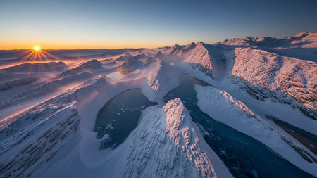 Arctic landscape at sunrise with snow-covered mountains, frozen lakes, and warm light.