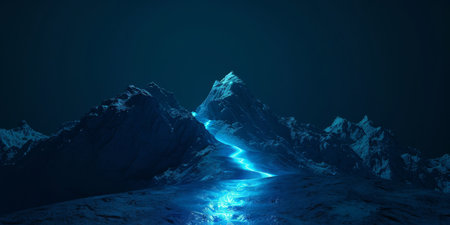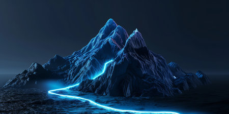Futuristic mountain with glowing path to the top. Desktop wallpaper, sci fi environment. High quality photo