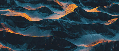 Shapes showing abstract liquid surface with golden light reflections and dark blue waves forming mountain-like...