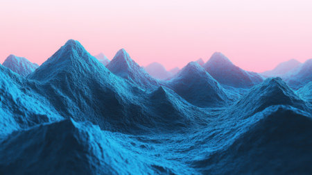 This abstract digital artwork features beautifully textured blue mountains set against a soft pink sky, creating a surreal evening atmosphere.
